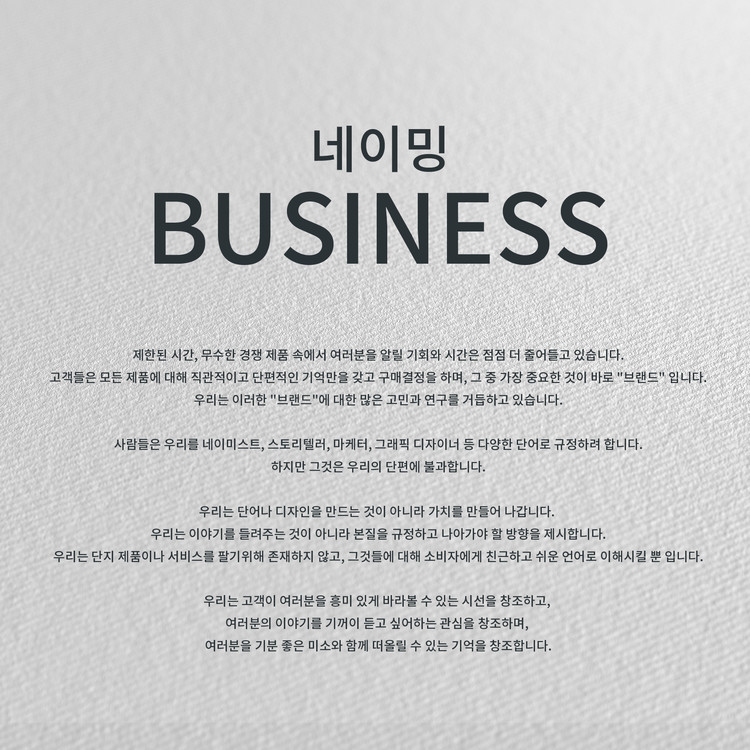 저희는 네이밍, 슬로건, 로고제작을 하나의 패키지로 제공합니다. 그 어느 것 하나도, 다른 목소리로, 다른 방향을 바라보아서는 안된다고 생각하기 때문입니다.